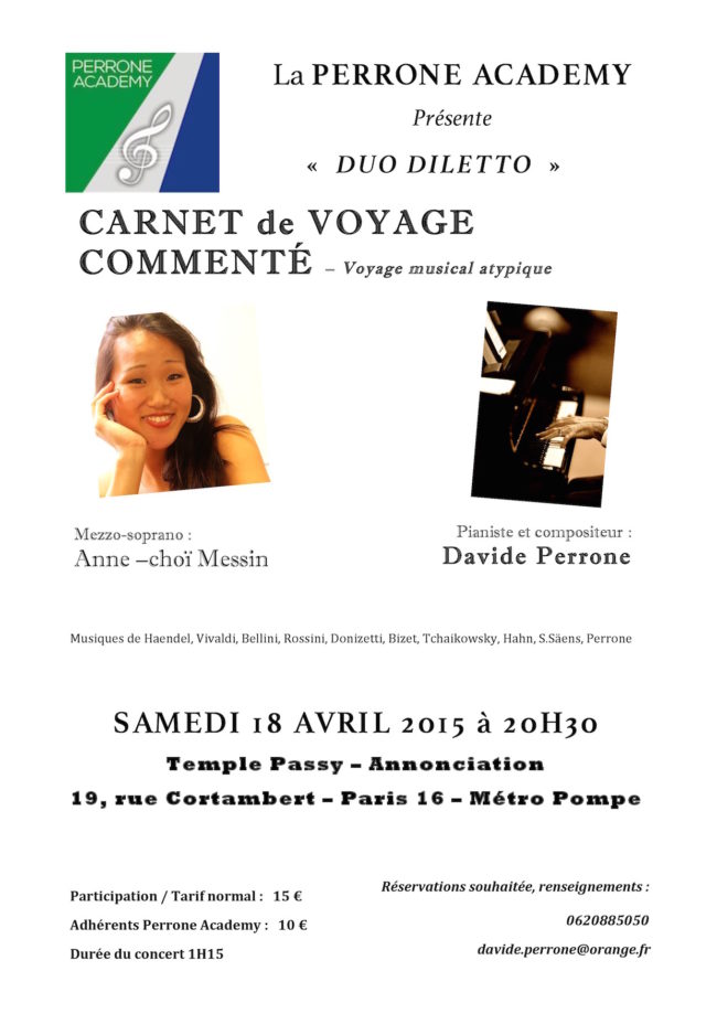Actualités CARNET DE VOYAGE COMMENTE Voyage musical atypique Musique de Haendel, Vivaldi, Bellini, Rossini, Donizetti, Bizet, Tchaikowsky, Hahn, S.Säens, Perrone Mezzo-soprano : Anne Choï Messin Pianiste compositeur : Davide Perrone Date : Samedi 18 avril 2015 à 20 h30 Lieu : Temple Passy – Annonciation 19, rue Cortambert – Paris 16 Métro Pompe Réservations souhaitée,…