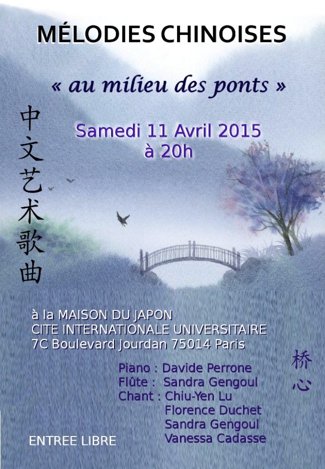 Actualités Concert de mélodies chinoises « Au milieu des ponts » Date : Samedi 11 avril 2015 à 20h. Lieu : Maison du Japon Cite Internationale Universitaire 7 Boulevard Jourdan 75004 Paris – Piano : Davide Perrone – Flûte : Sandra Gengoul – Chant : – Chiu-Yen Lu – Florence Duchet – Sandra Gengoul – Vanessa Cadasse…