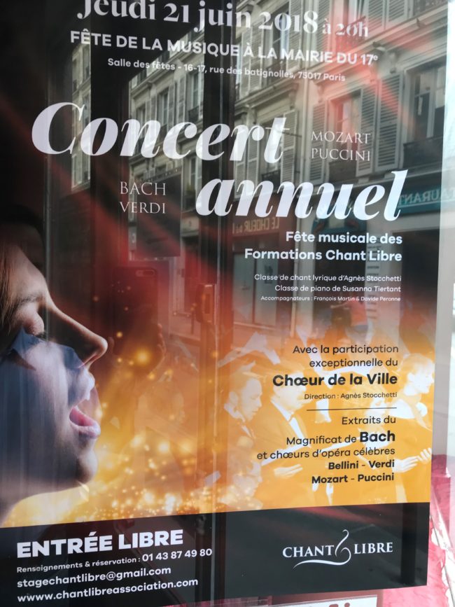 Actualités Concert annuel – Fête de la musique Formations Chant Libre Date : jeudi 21 juin à 20h. Lieu : Salle des fêtes 16-17, rue des Batignolles, 75017 PARIS Tél. : 01 43 87 49 80 Entrée libre