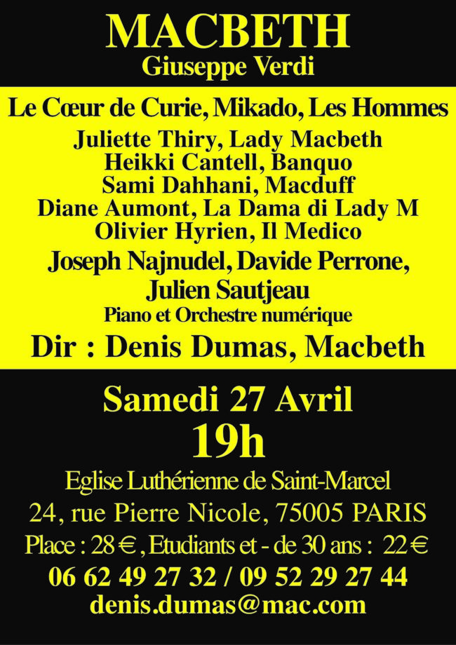 Actualités MACBETH Giuseppe Verdi Date : Samedi 27 avril à 19h. Lieu : Eglise Luthérienne de Saint-Marcel 24 rue Pierre Nicole, 75005 PARIS Tél. : 06 62 49 27 32 / 09 52 29 27 44 Tarifs : Place : 28 €, étudiants et – de 30 ans : 22 €